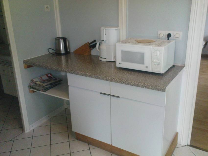 Die Küche ist voll eingerichtet: Mikrowelle, Kaffeemaschine, Toaster ,